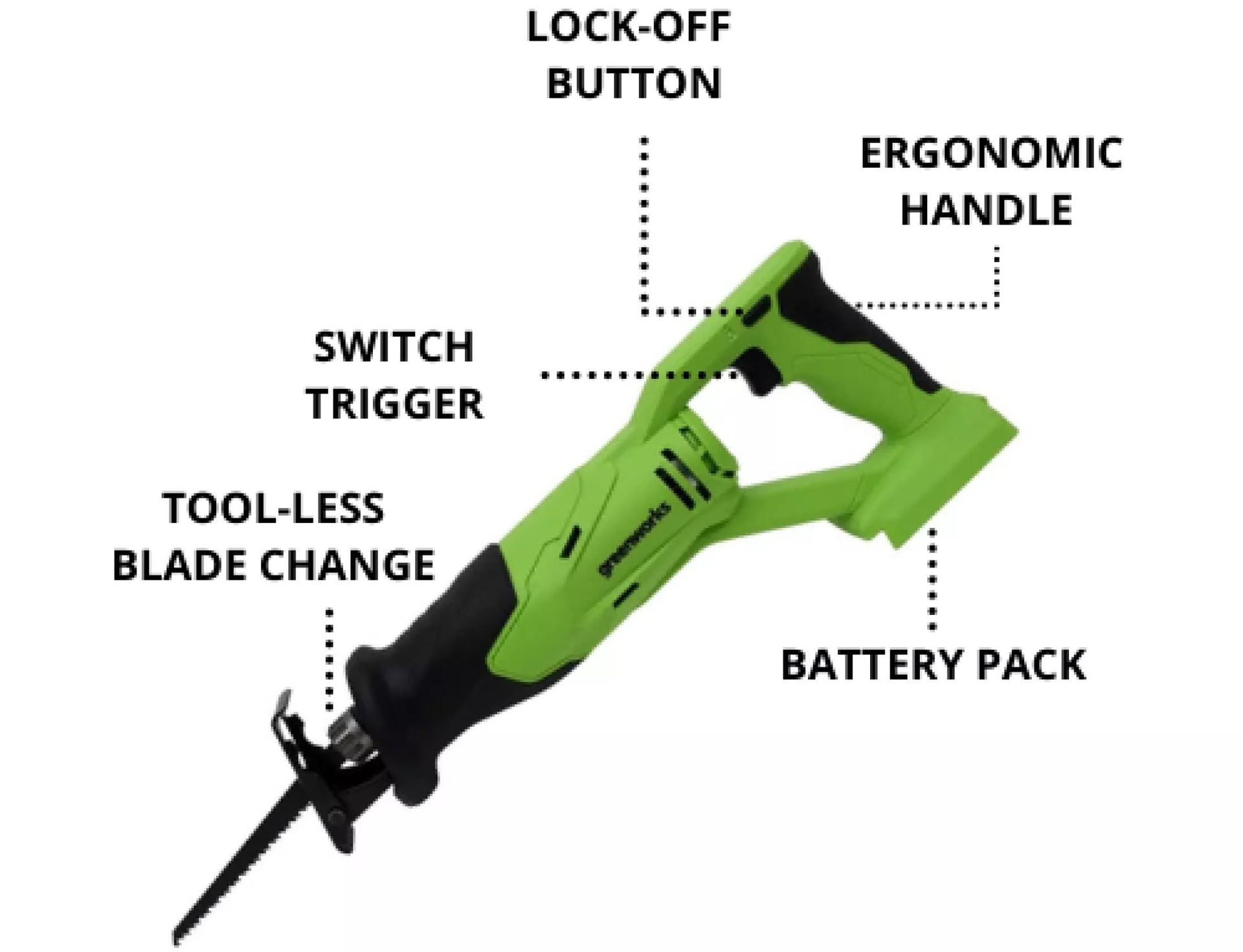 - Greenworks G24RS has a large blade resembling that of a jigsaw.