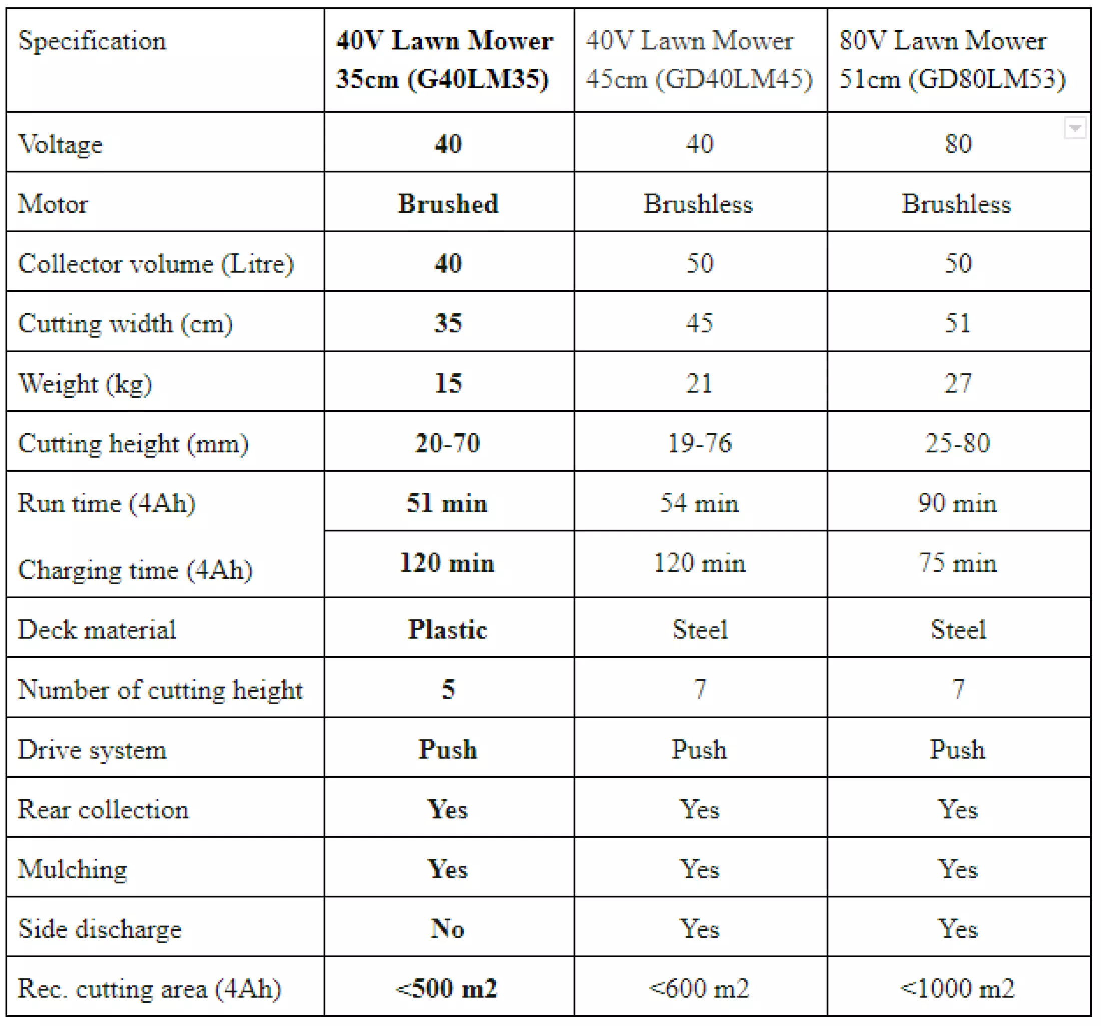 - The grass catcher of G40LM35 is 40 liters which gives users more time for mowing and reduces the time for emptying the container.