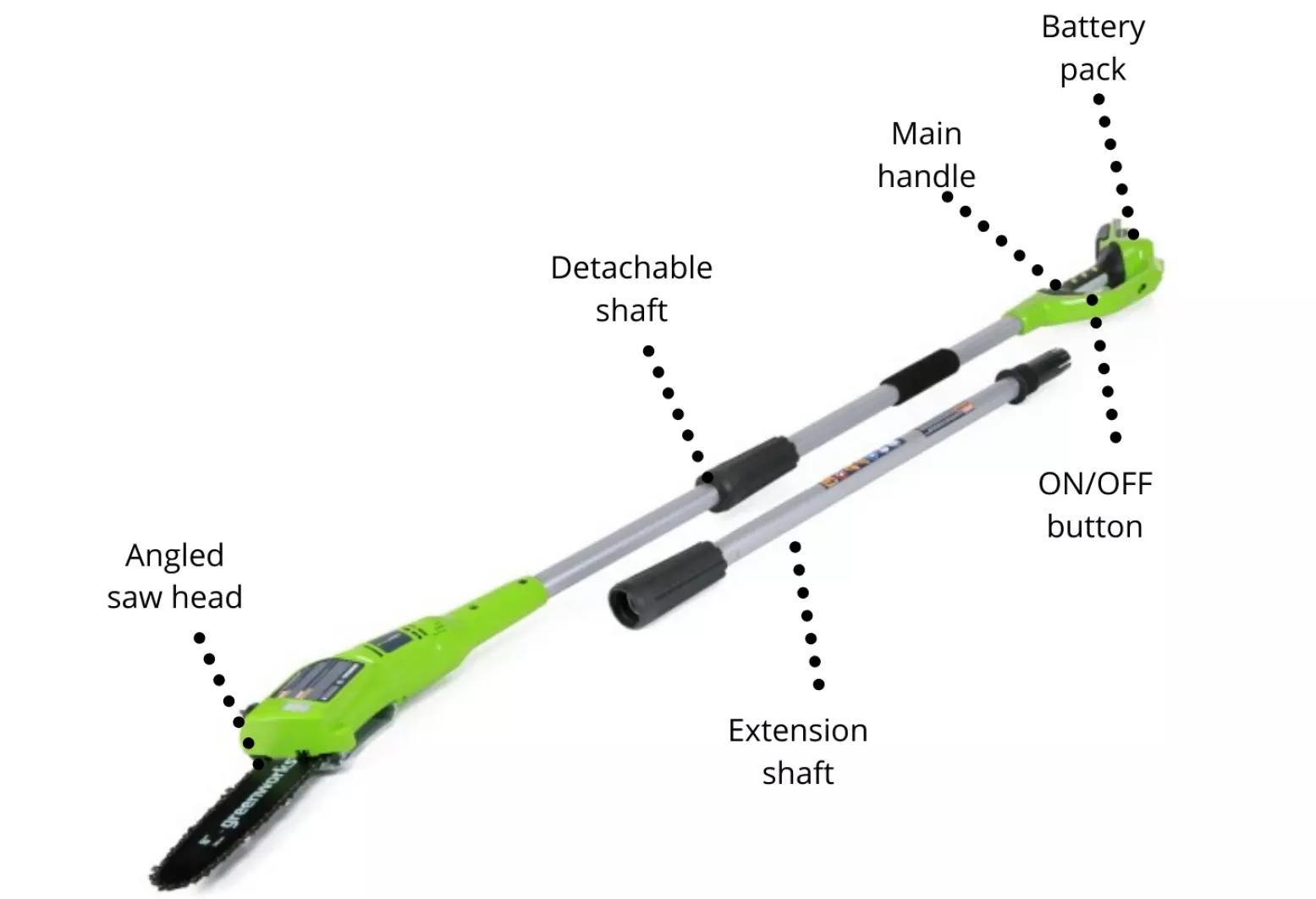 - This pole saw doesn't only eliminate by giving the users the reach they need, but also removes another hazard which is petrol.