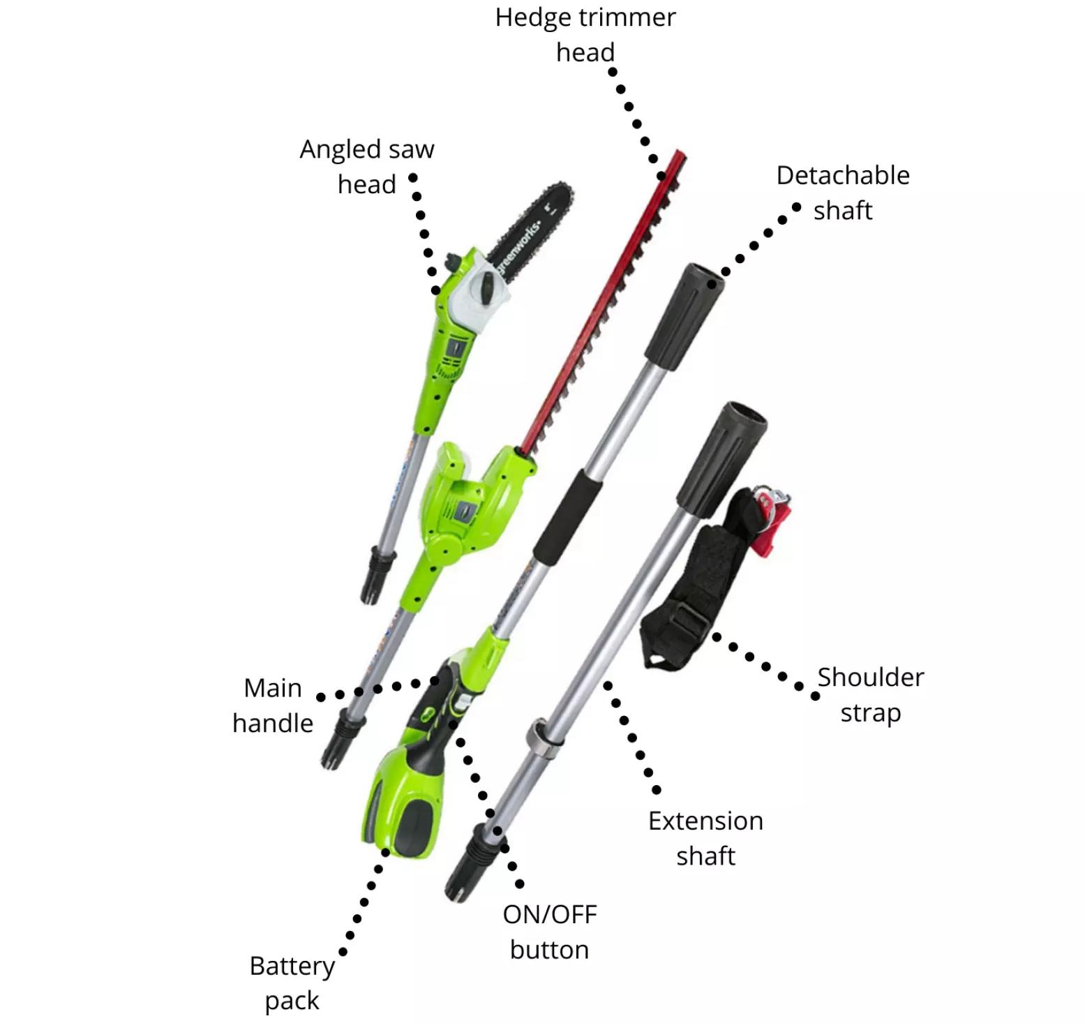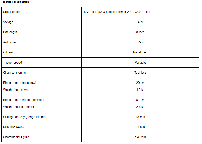 • G40PSHT is a Greenworks 40V battery branch saw and hedge trimmer on stem type which the users have one handle and two machines.