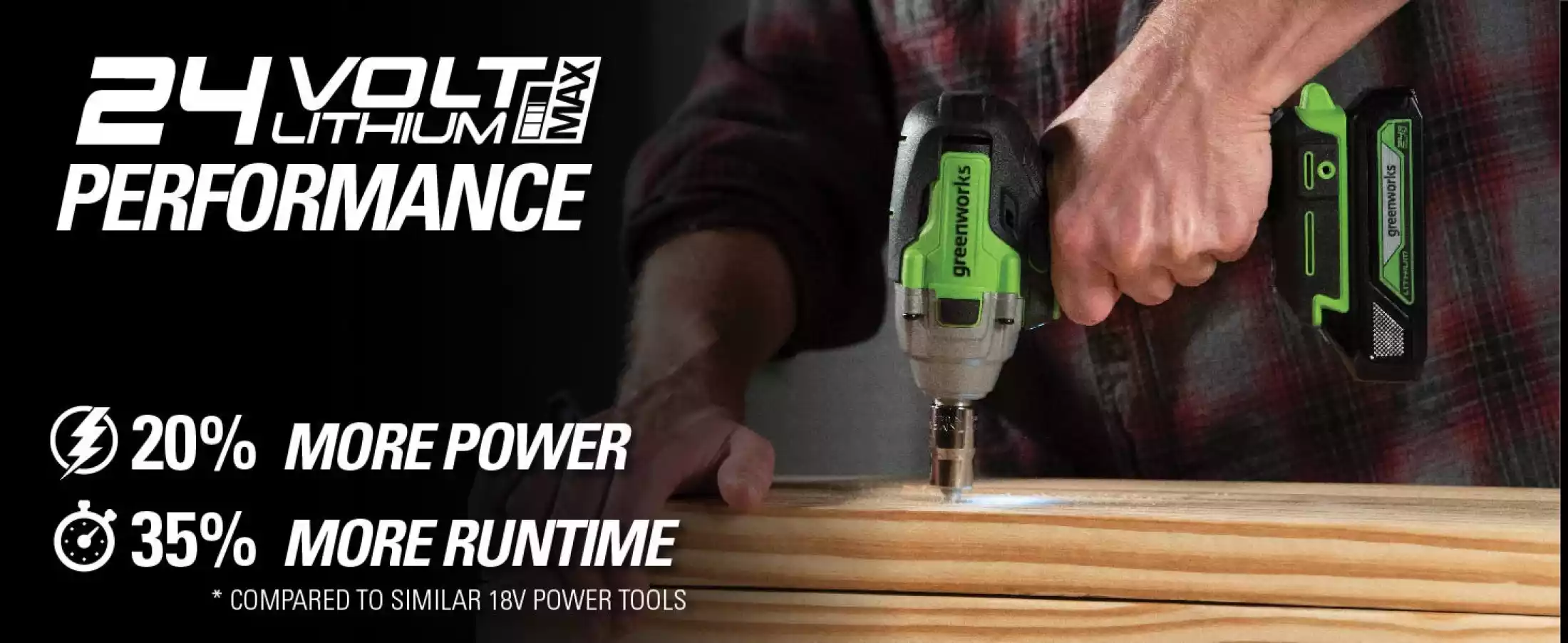 4V Brushless motor provides more torque, quiet operation and longer life. Tighten and loosen the most stubborn nuts and bolts with the 24V Brushless 1/2" Impact Wrench from Greenworks. At up to 540ft-lb of torque, this impact wrench is powerful - while remaining compact for any application. Greenworks 24V lithium-Ion battery provides 20% more power and 35% more run-time, and delivers fade-free power with no memory loss after charging.