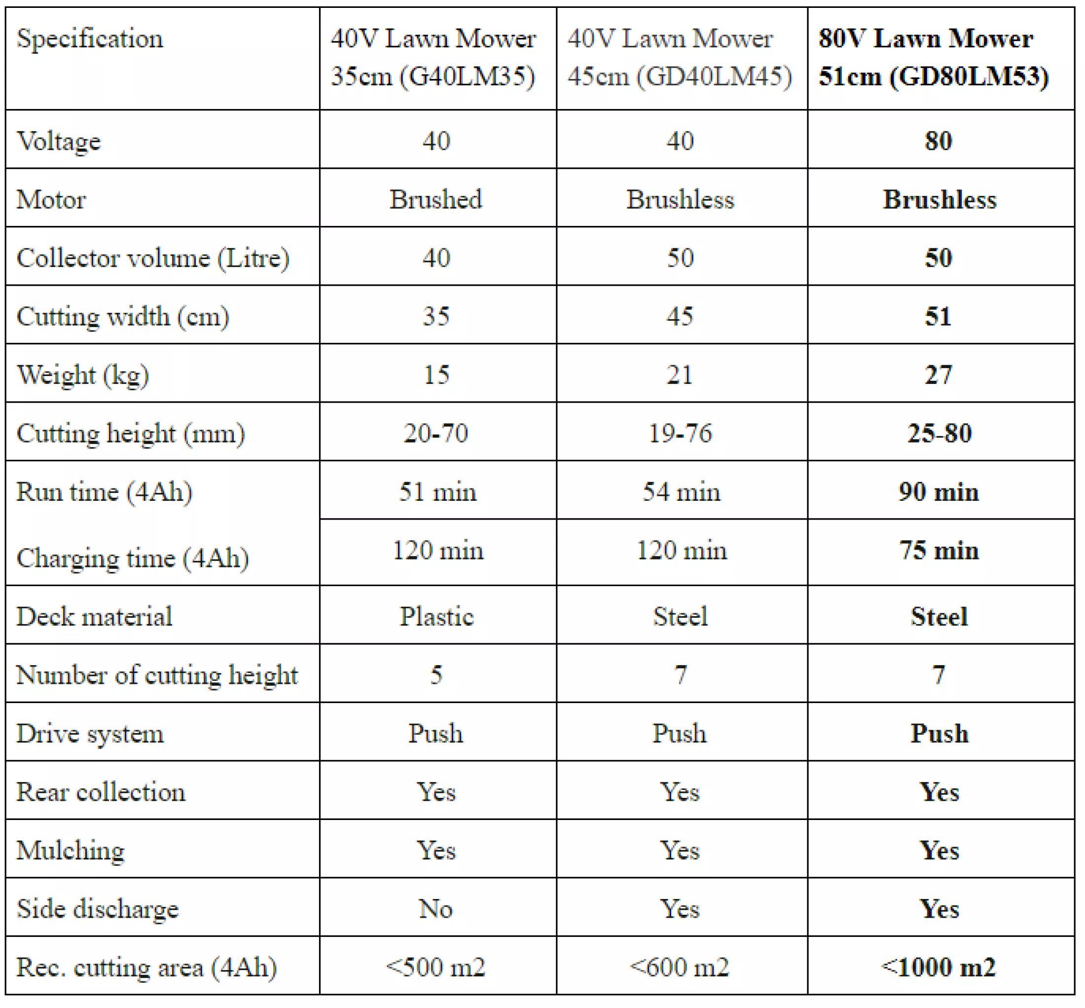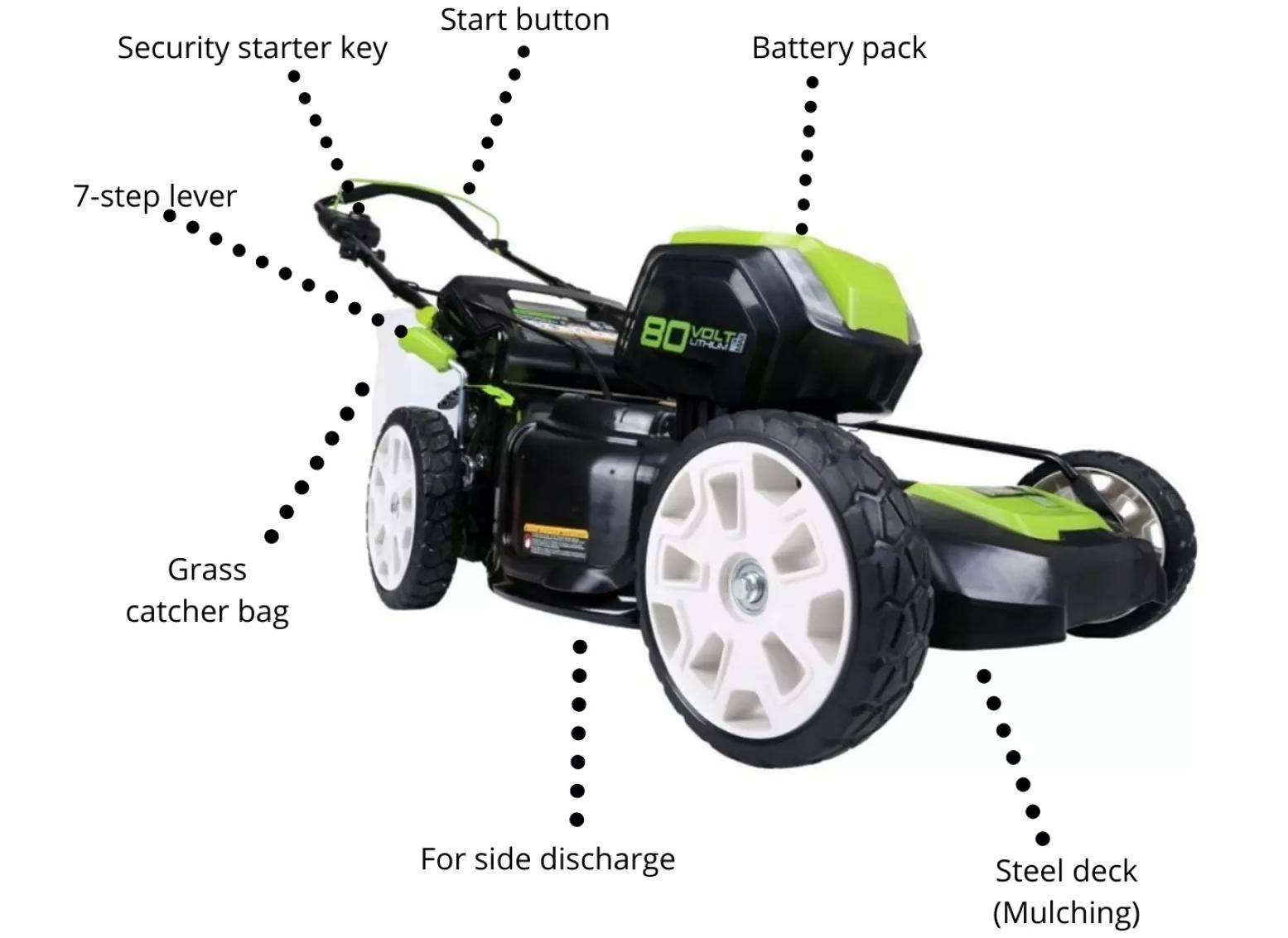 - Thanks to the 80 Volt Lithium ION battery, GD80LM53 has a long mowing time.
